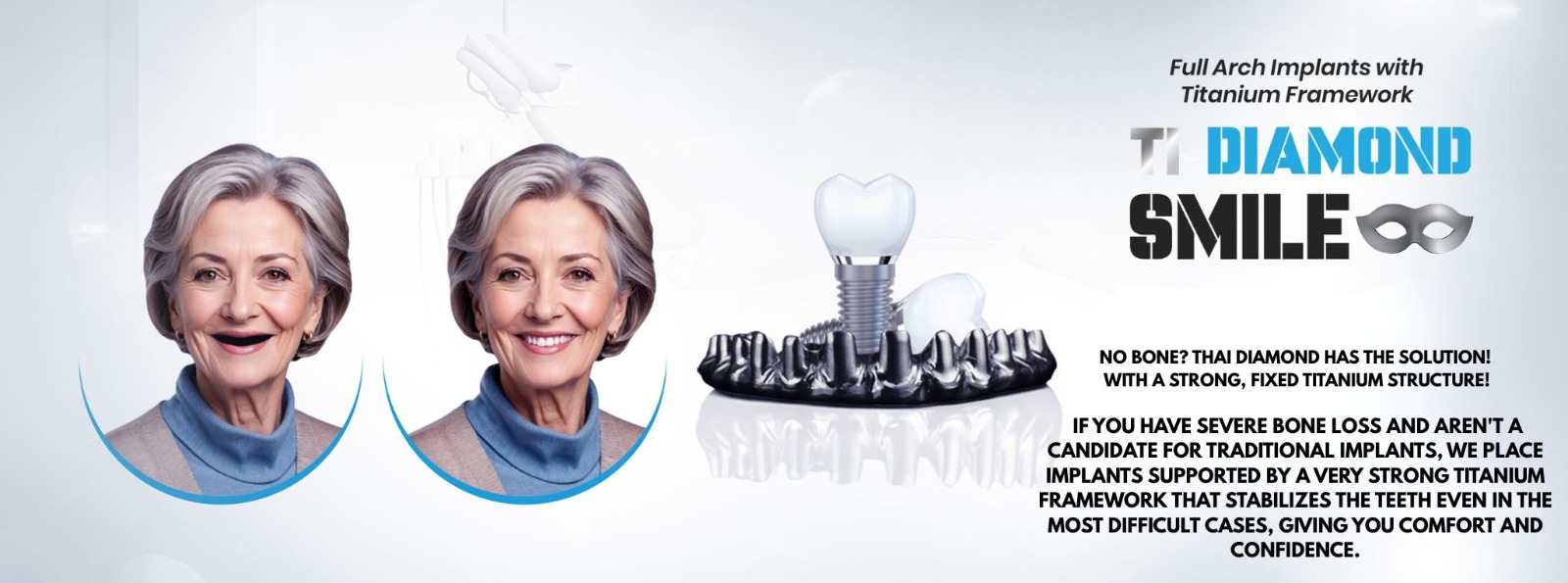 A journey to a new smile with Ti-Diamond Smile, a comprehensive treatment plan that includes jaw implants, temporary restorations, and a customized smile design. Book your consultation now.